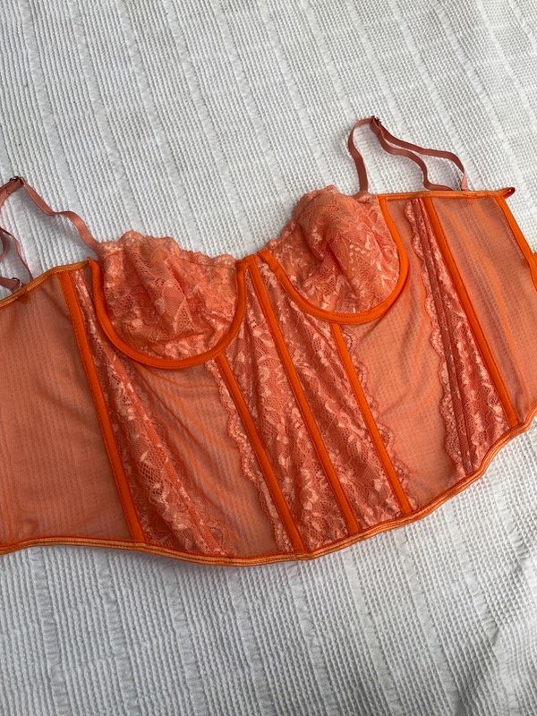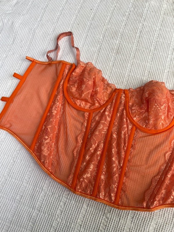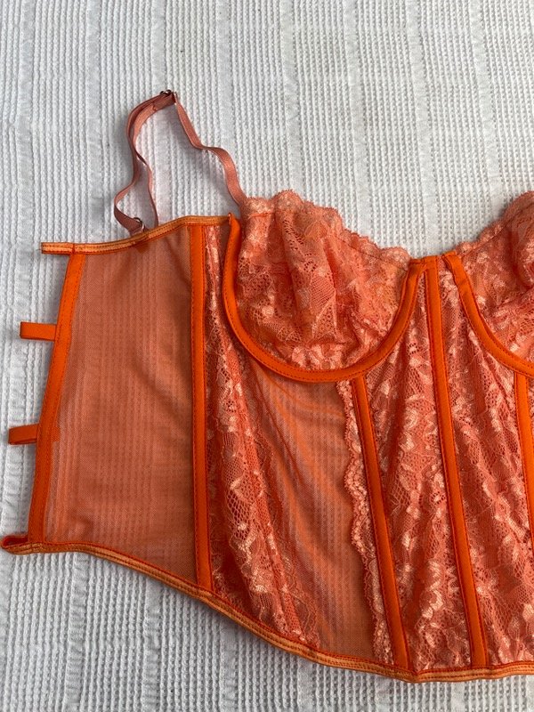Corset con taza balconette, aro entero y ballenas para dar estructura. Está confeccionado en Microtul y puntilla. Tazas forradas con tela de algodón (no taza rígida) para que no transparente. Breteles regulables. Se ata en la espalda con cinta